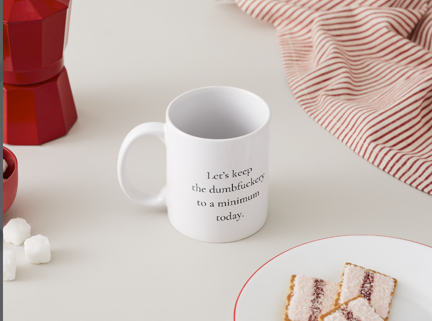 Sip your coffee (or tea) with a playful reminder to keep the dumbfuckery to a minimum today. This 11oz ceramic mug is perfect for family, friends, and colleagues. Enjoy your drink and a laugh with the Dumfuckery Mug.