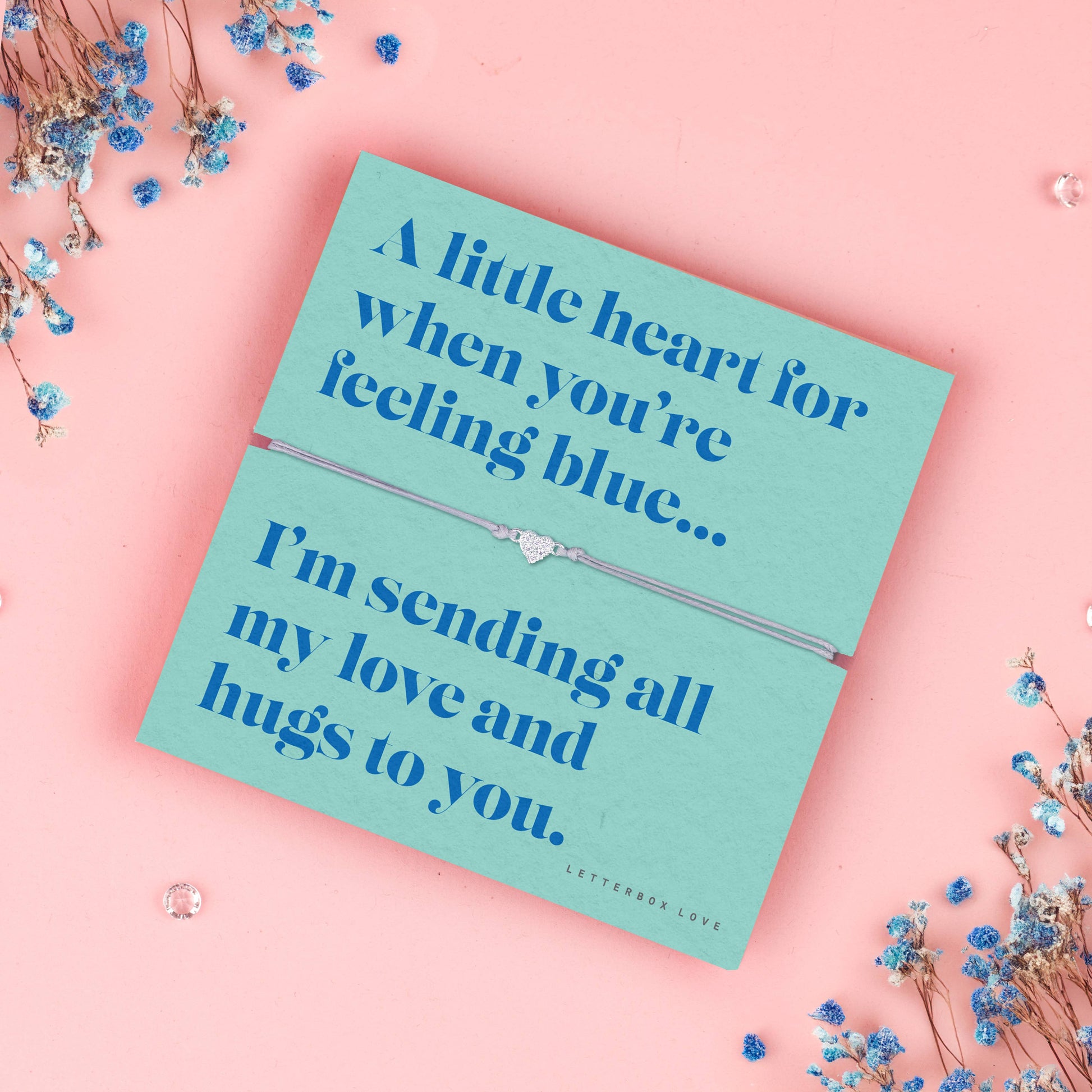 The Sending Hugs bracelet features a delicate heart charm on an adjustable thread, mounted on a vibrant blue poem card that reads: “A little heart for when you're feeling blue, I'm sending all my love to you.” This heartfelt token is perfect for customers looking to send a hug through the post — a gentle reminder they’re not alone.