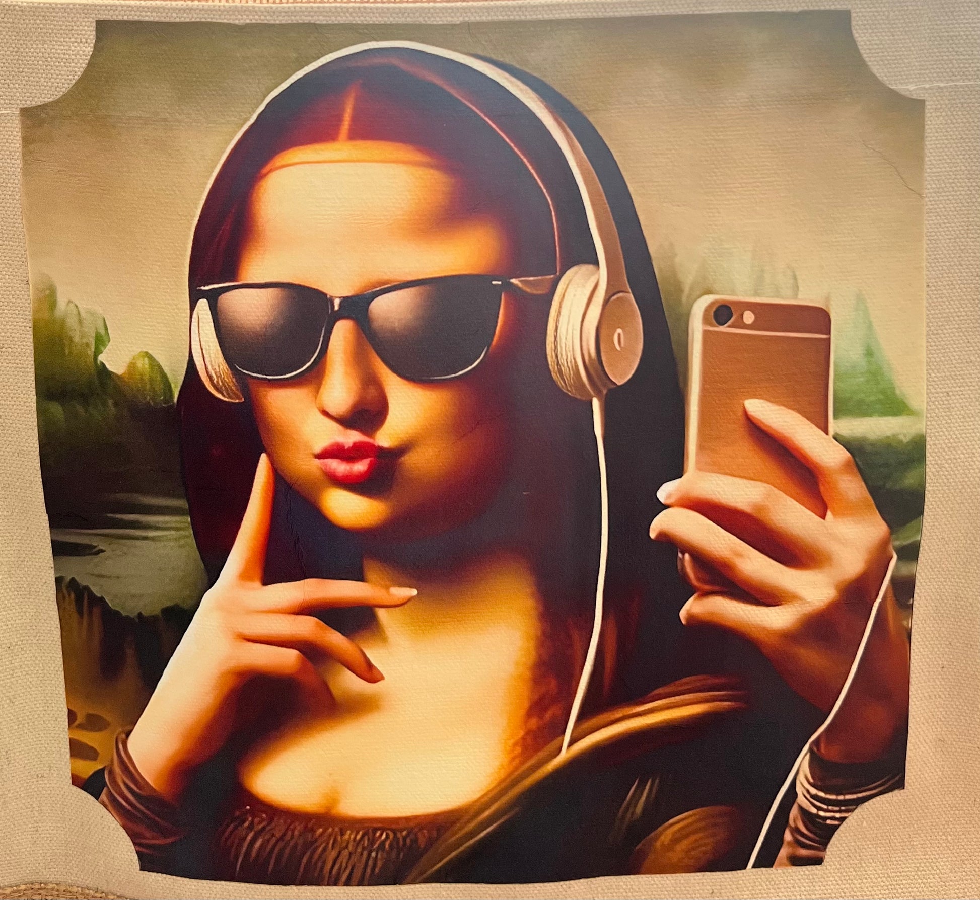 This stylish Hessian tote bag features the iconic Mona Lisa pouting, making it a fun and unique accessory for art lovers. With its durable material and spacious design, it's perfect for carrying daily essentials while adding a touch of art to your outfit. Show off your love for art with this one-of-a-kind tote bag.