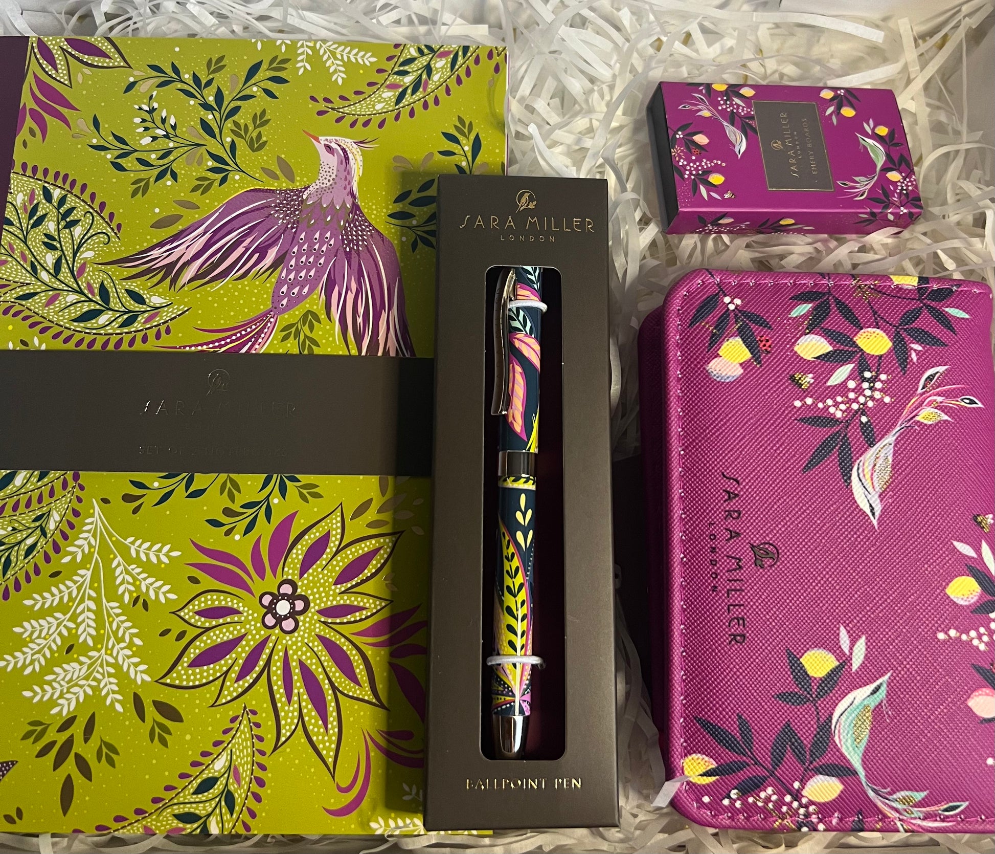 Introducing the Sara Miller Gift Set, the perfect gift for any occasion. This set includes two stylish and beautiful note books, a sleek pen, a convenient manicure set, and a matchbox of emery boards. Treat yourself or a loved one to this elegant and practical gift set.