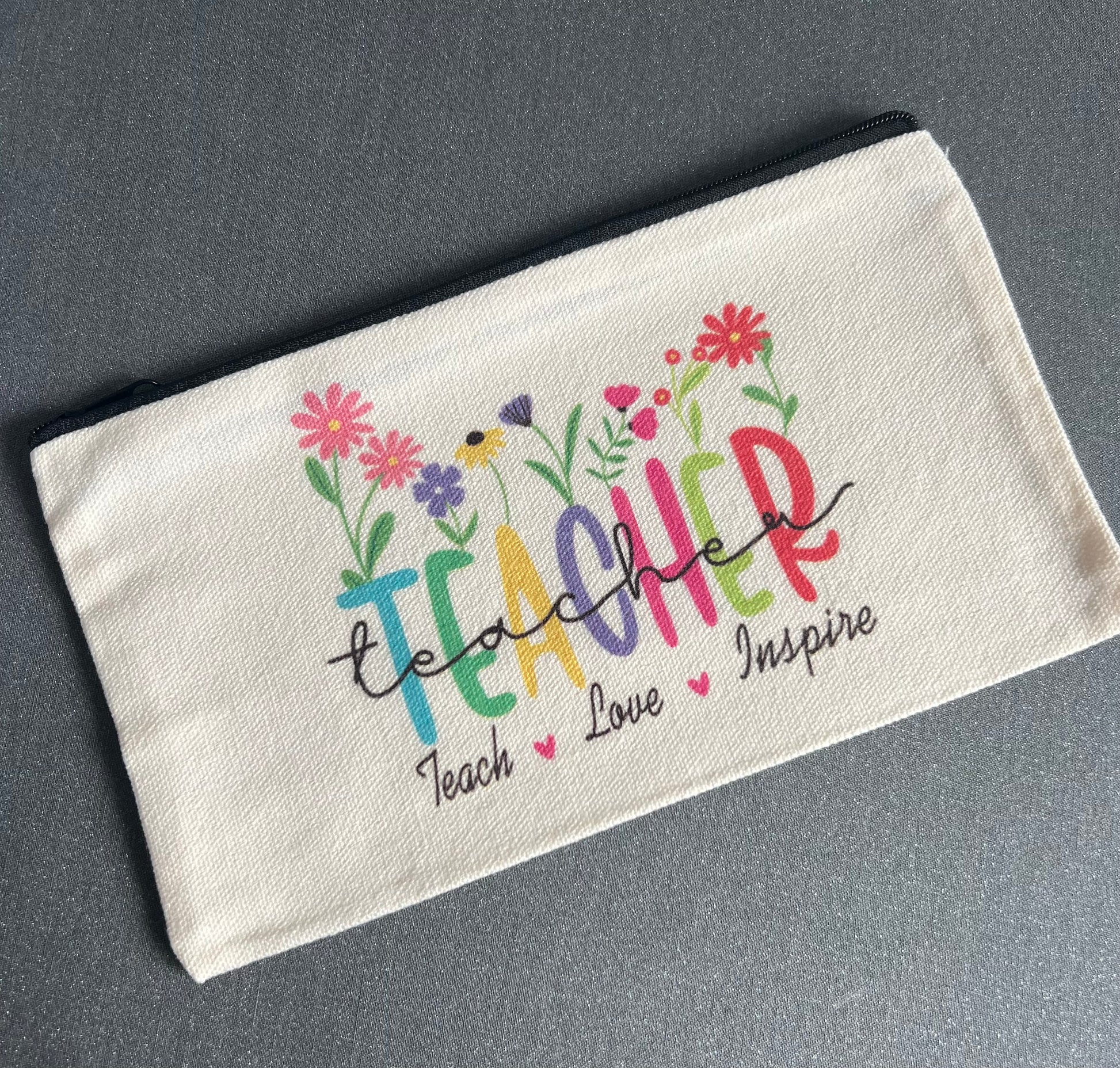 Perfect for the end of the school year, this Teacher Canvas Pencil Case is a practical gift to show your appreciation for your teacher. Made of durable canvas with a pretty print, it's both functional and thoughtful. A must-have for any teacher's desk!